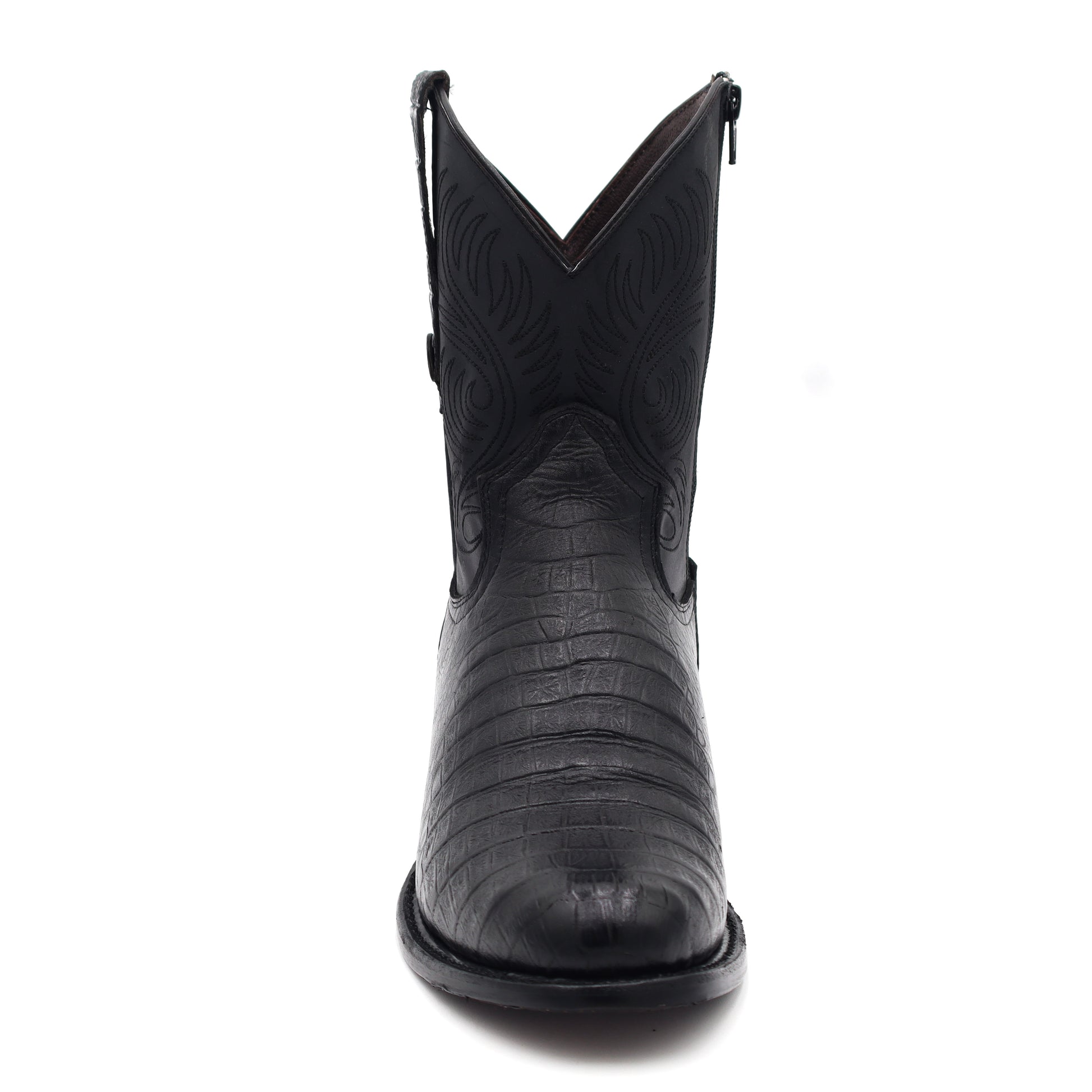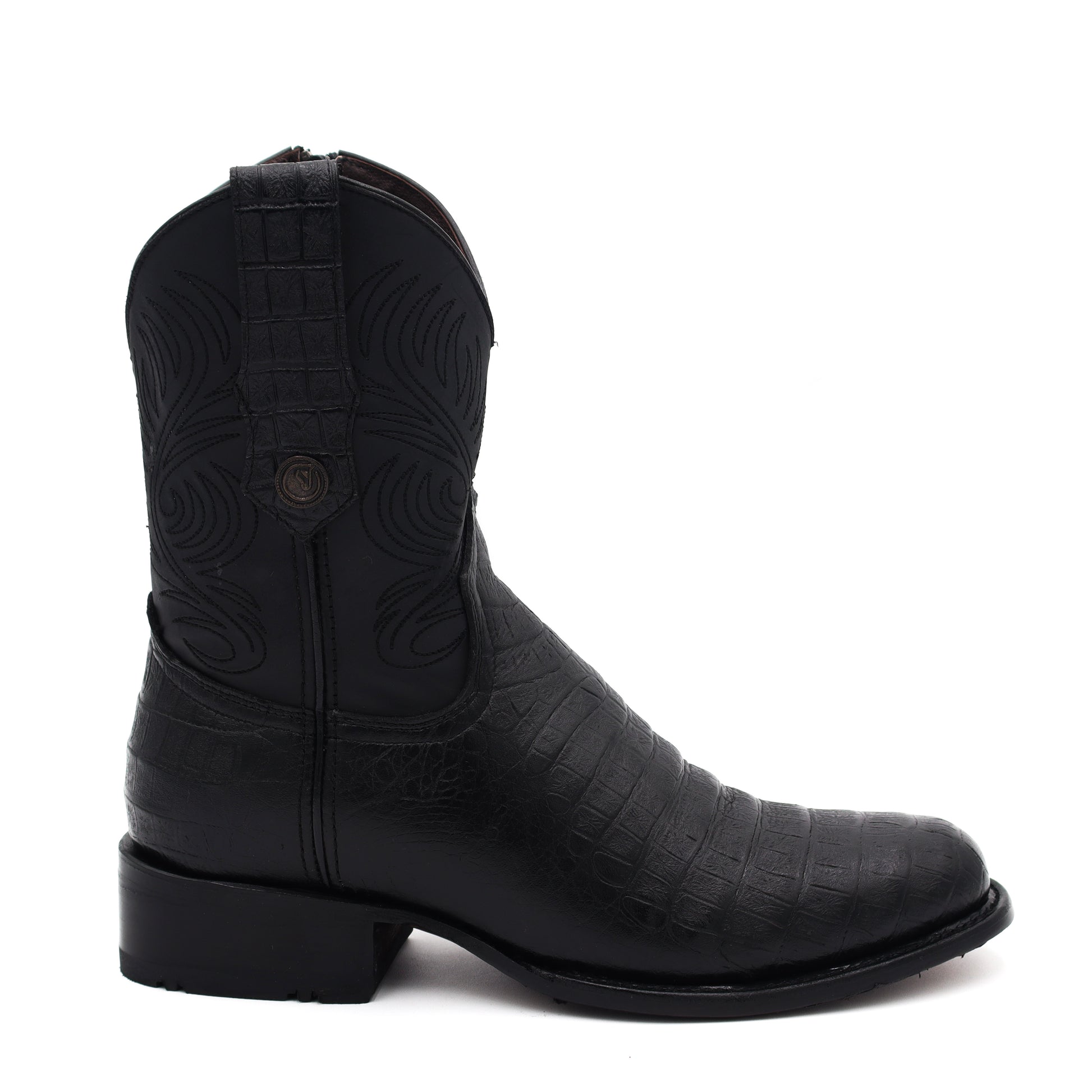 This Alaska Cuello Toro Negro Oval boot is designed with a skinny fit and convenient zipper closure, making it a versatile and comfortable option to pair with any pants. Its cowboy style adds a touch of fashion to its practicality.