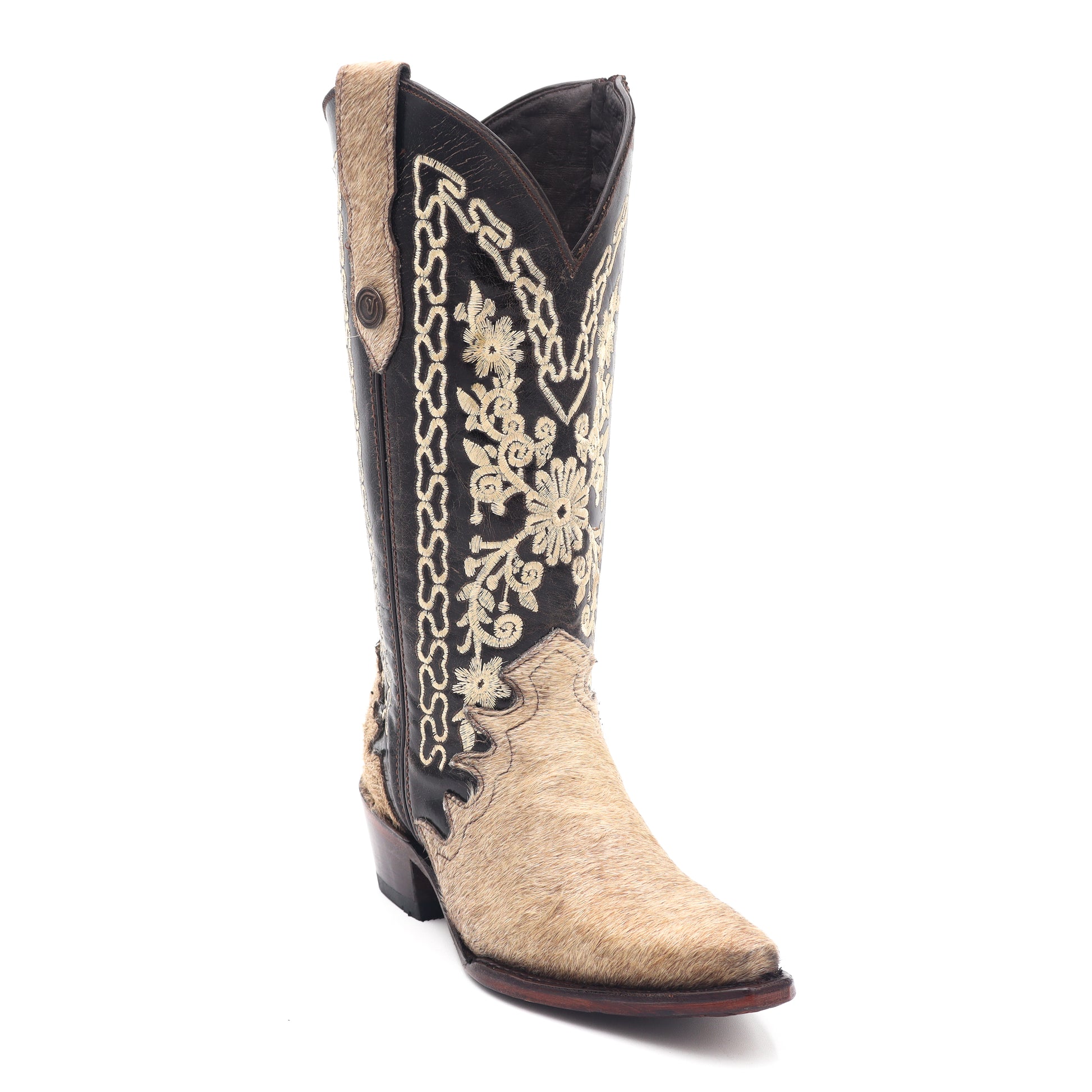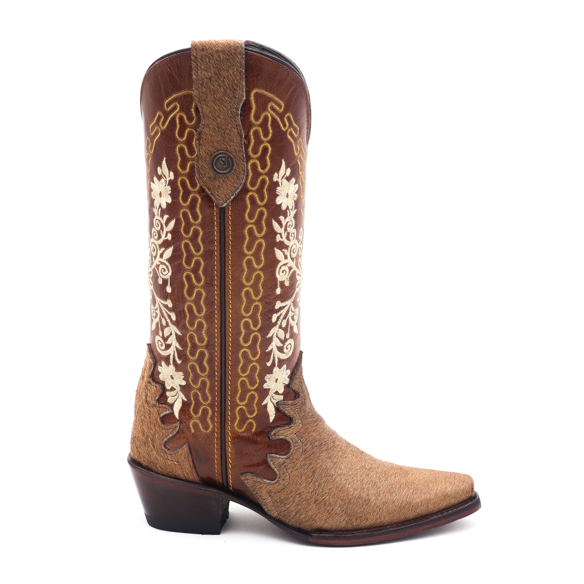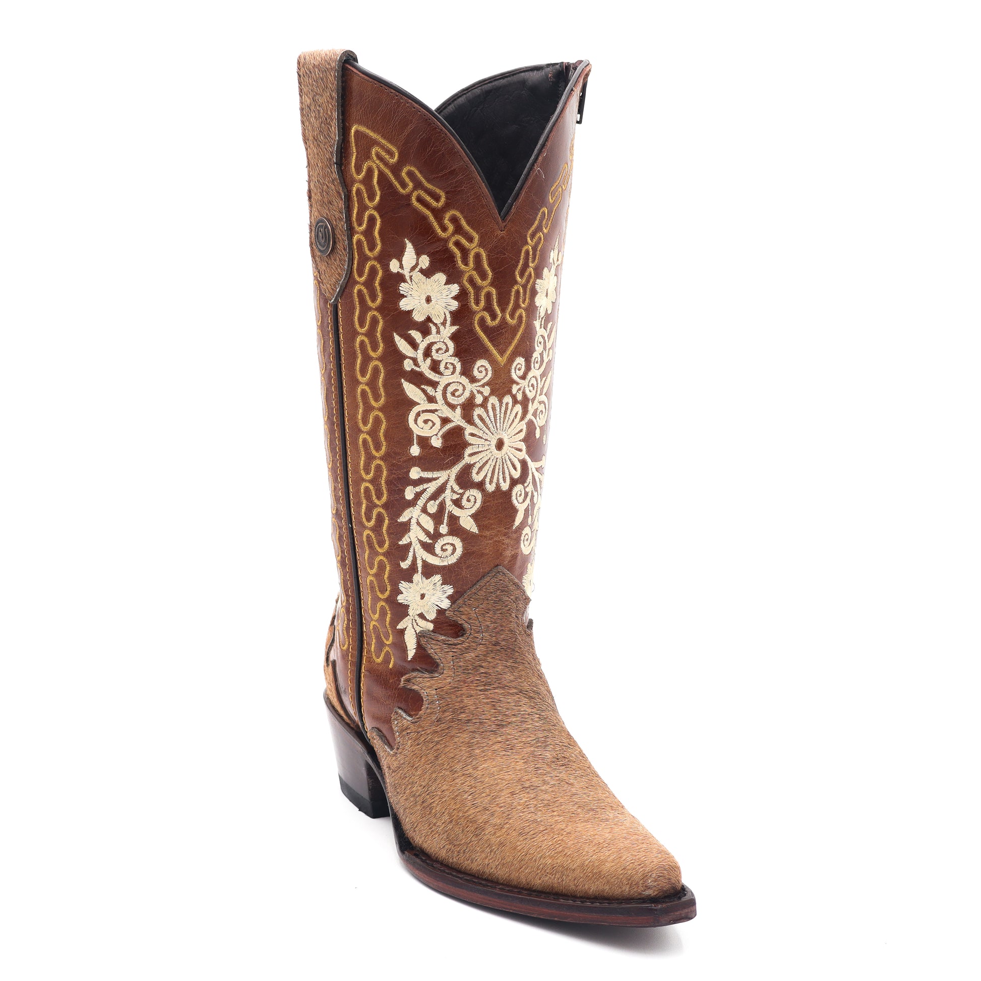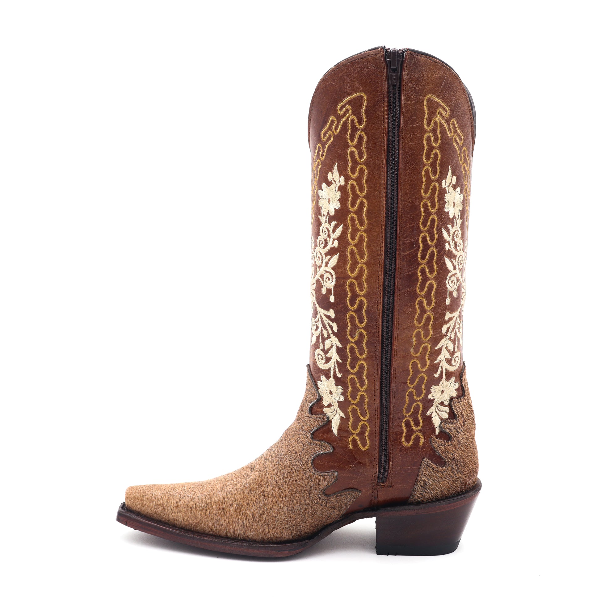 Esta bota puntal Darsha Pelo está elaborada con auténtico pelo de vaca, combinando estilo y durabilidad. Cuenta con cierre para un ajuste seguro y cómodo, además de un elegante tacón cubano que aporta sofisticación. Su diseño llega arriba de la pantorrilla, ideal para complementar cualquier atuendo con un toque audaz. La suela de cuero presenta un delicado grabado de flores, que añade un detalle artesanal único y resistente, garantizando calidad en cada paso. Perfecta para quienes buscan una mezcla de tradición y modernidad en calzado.
