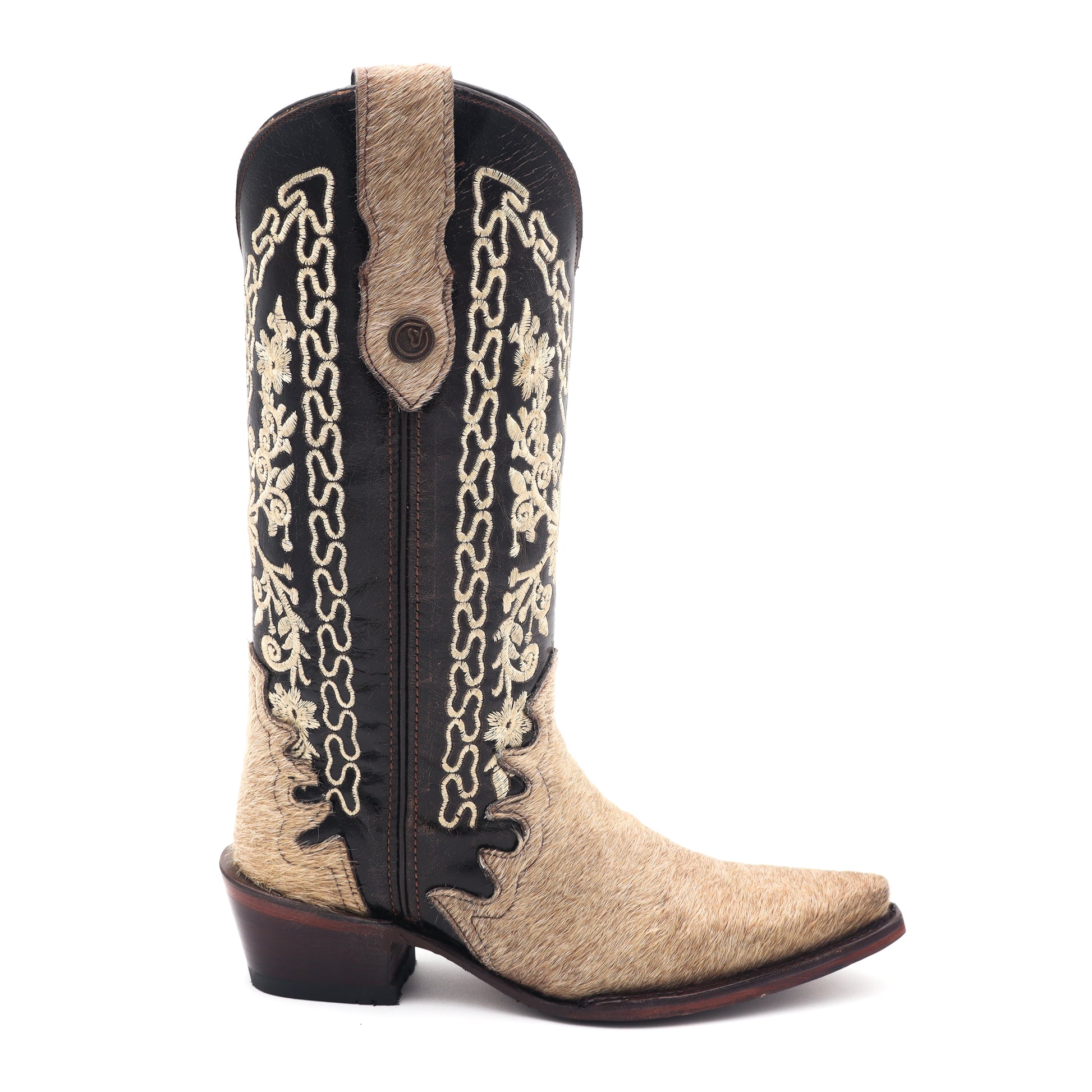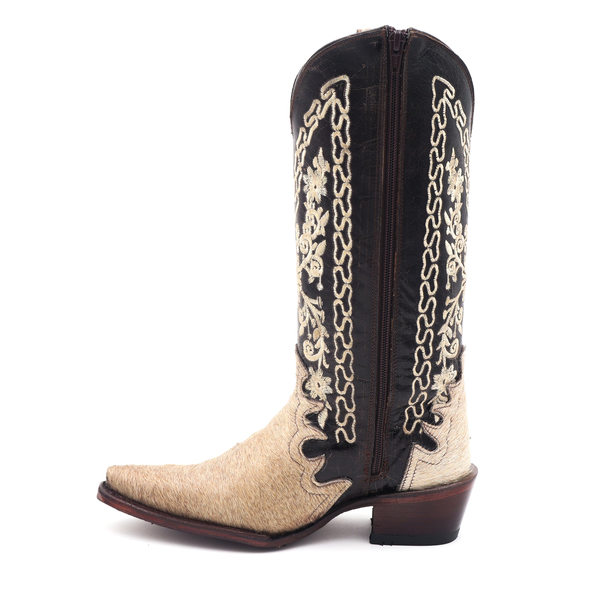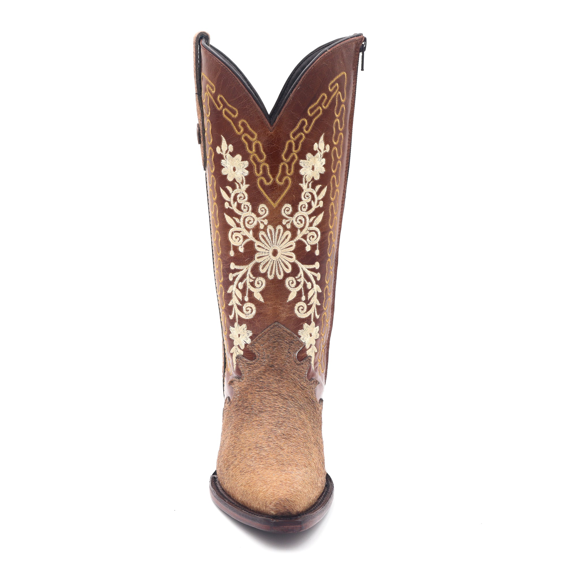 Esta bota puntal Darsha Pelo está elaborada con auténtico pelo de vaca, combinando estilo y durabilidad. Cuenta con cierre para un ajuste seguro y cómodo, además de un elegante tacón cubano que aporta sofisticación. Su diseño llega arriba de la pantorrilla, ideal para complementar cualquier atuendo con un toque audaz. La suela de cuero presenta un delicado grabado de flores, que añade un detalle artesanal único y resistente, garantizando calidad en cada paso. Perfecta para quienes buscan una mezcla de tradición y modernidad en calzado.