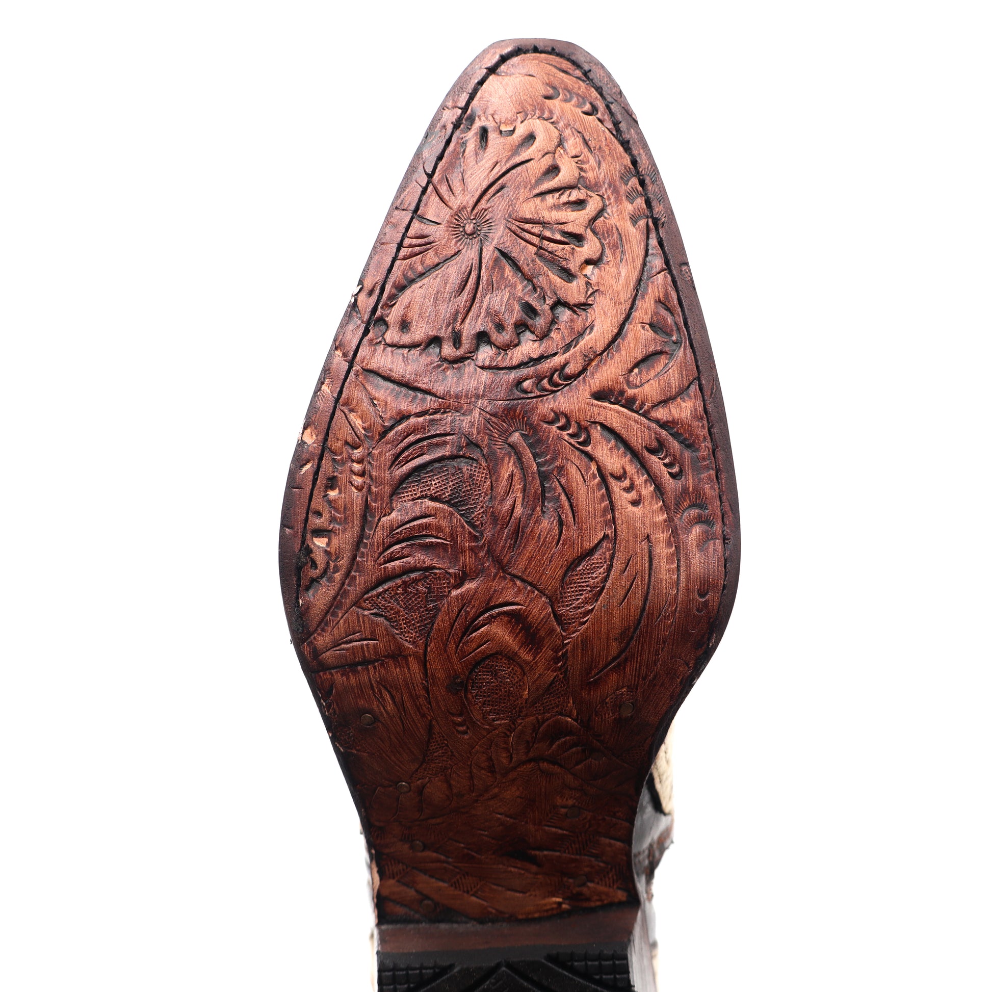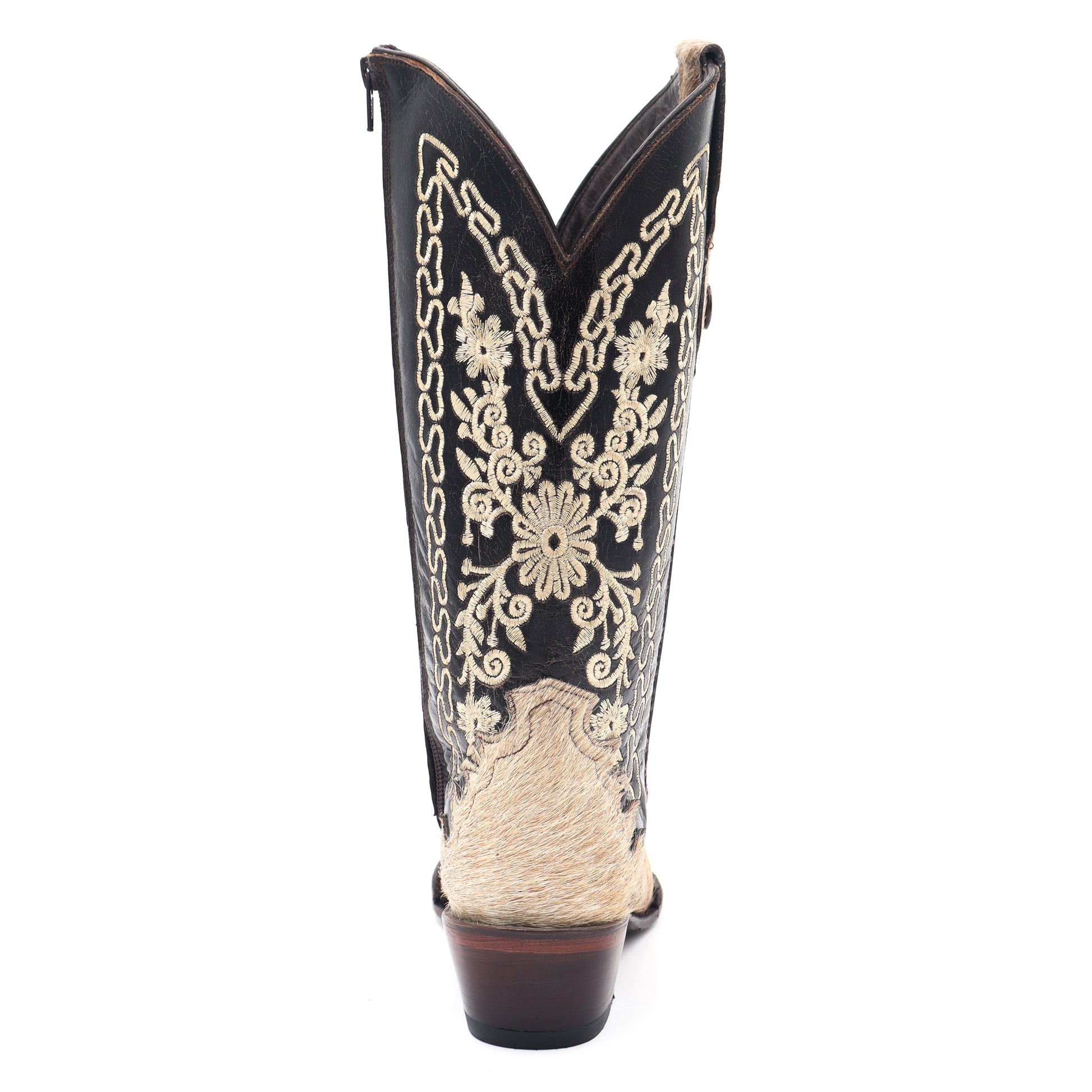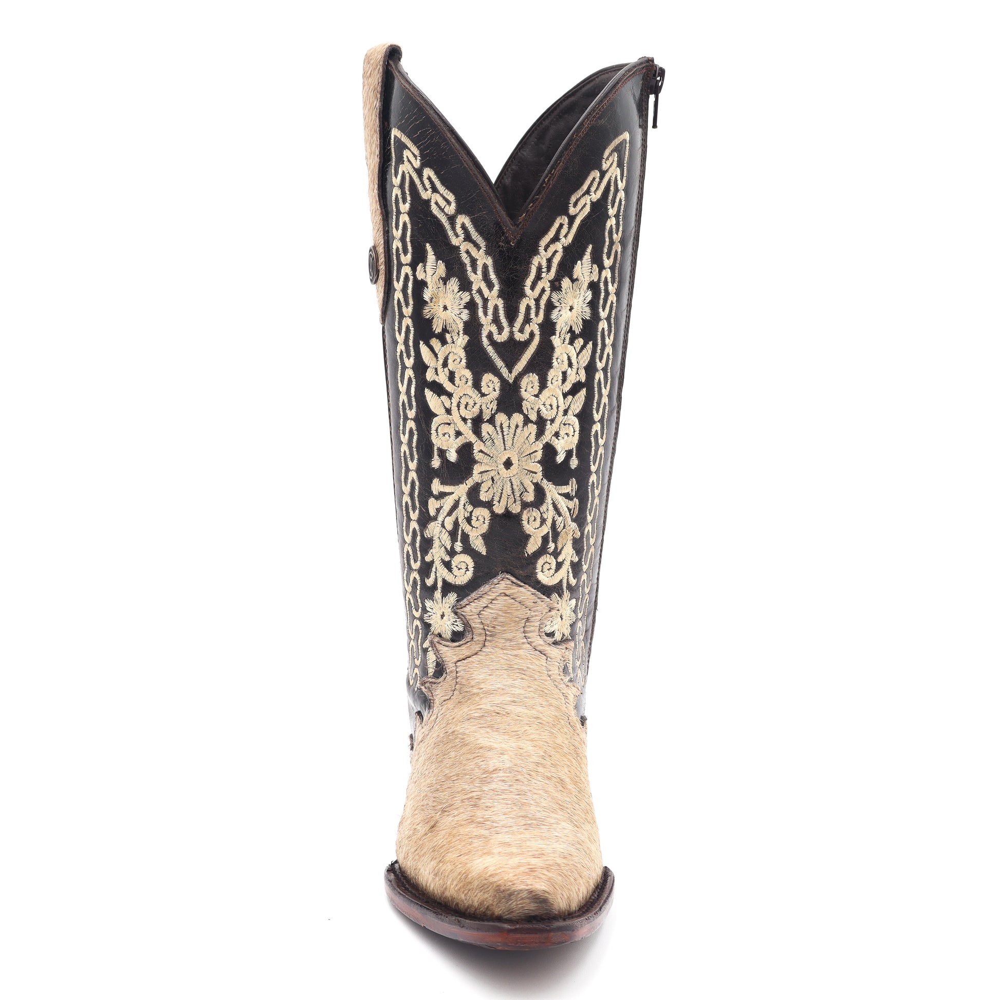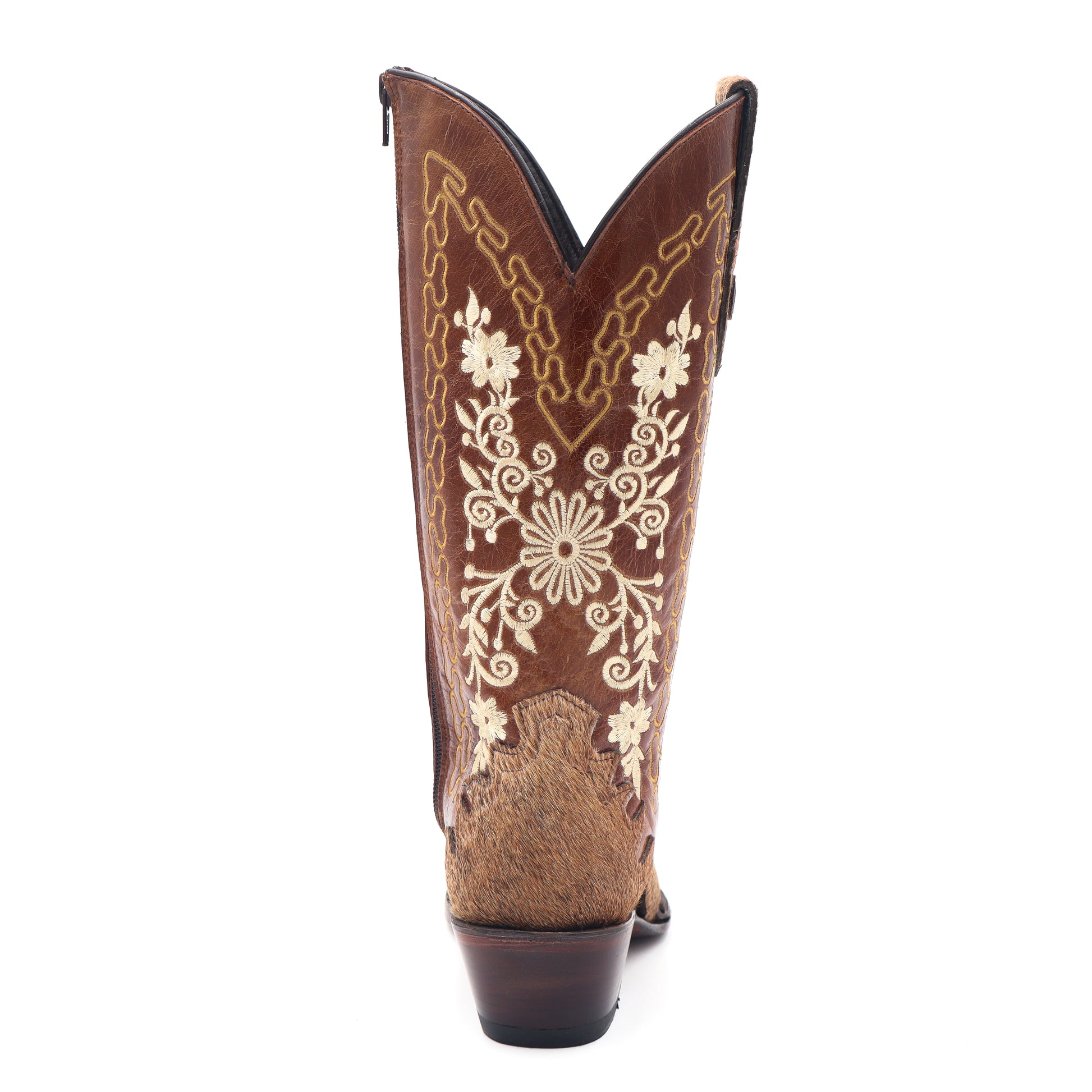 Esta bota puntal Darsha Pelo está elaborada con auténtico pelo de vaca, combinando estilo y durabilidad. Cuenta con cierre para un ajuste seguro y cómodo, además de un elegante tacón cubano que aporta sofisticación. Su diseño llega arriba de la pantorrilla, ideal para complementar cualquier atuendo con un toque audaz. La suela de cuero presenta un delicado grabado de flores, que añade un detalle artesanal único y resistente, garantizando calidad en cada paso. Perfecta para quienes buscan una mezcla de tradición y modernidad en calzado.