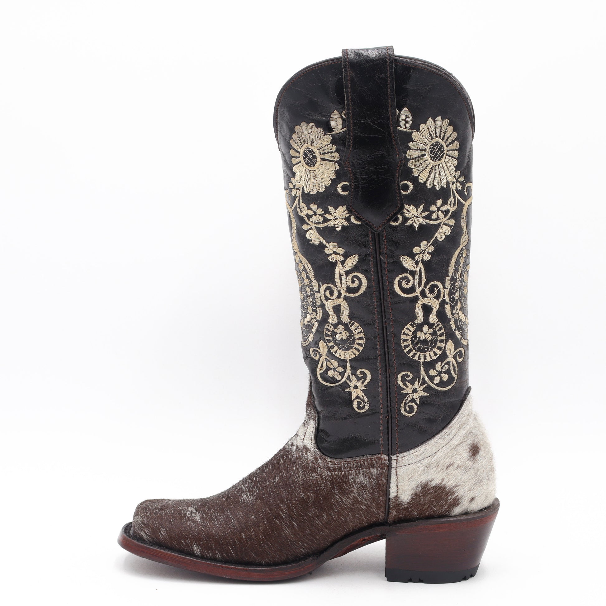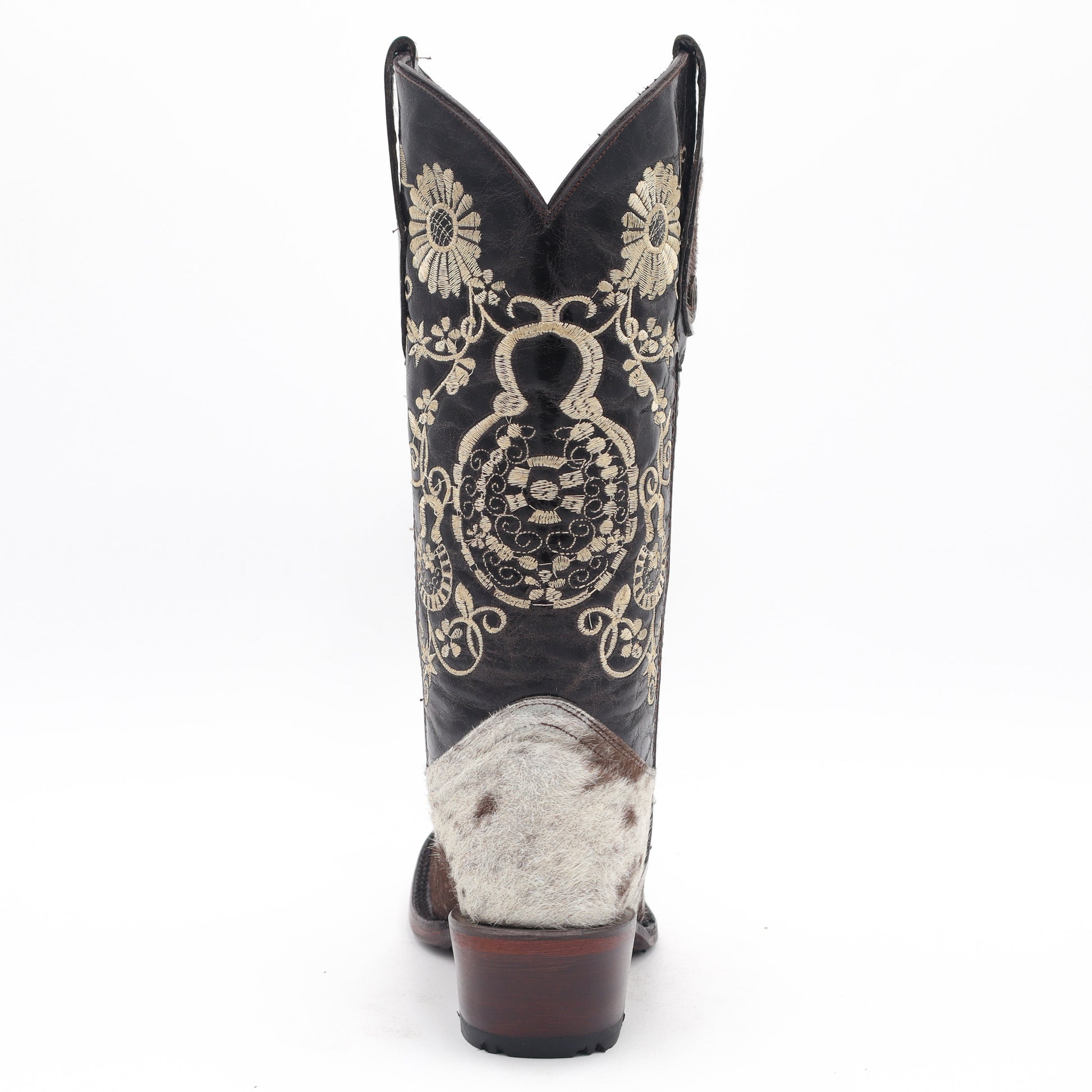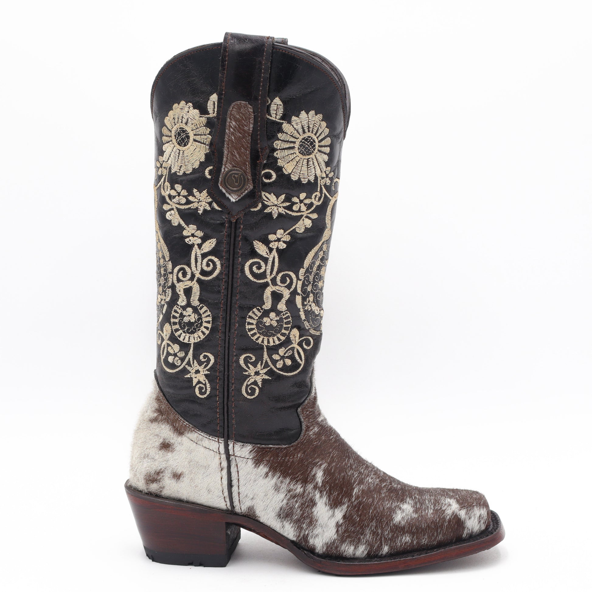The Geretana Pelo Negro/Gris Cuadrada is a high boot with the traditional embroidered design of Zacatecas' arracadas. Feel stylish and rooted in Mexican culture with this unique footwear.