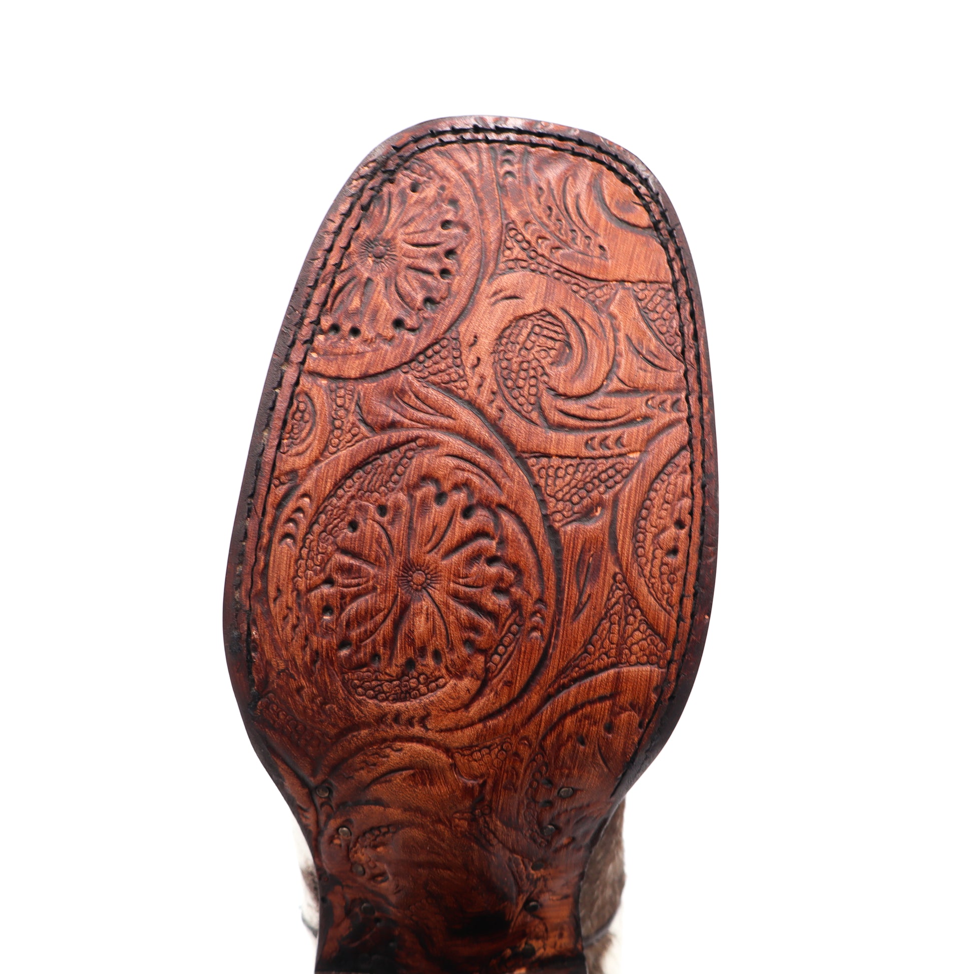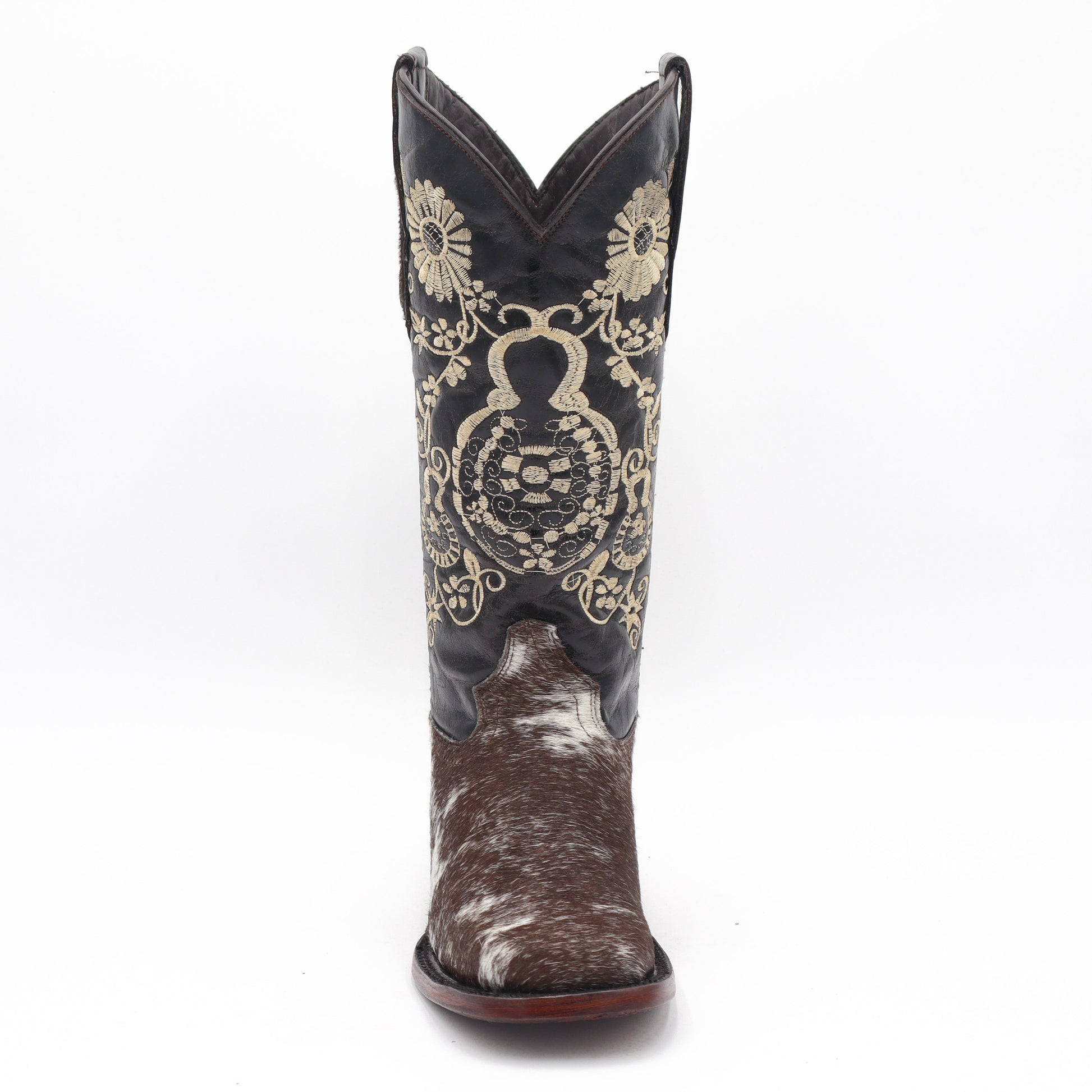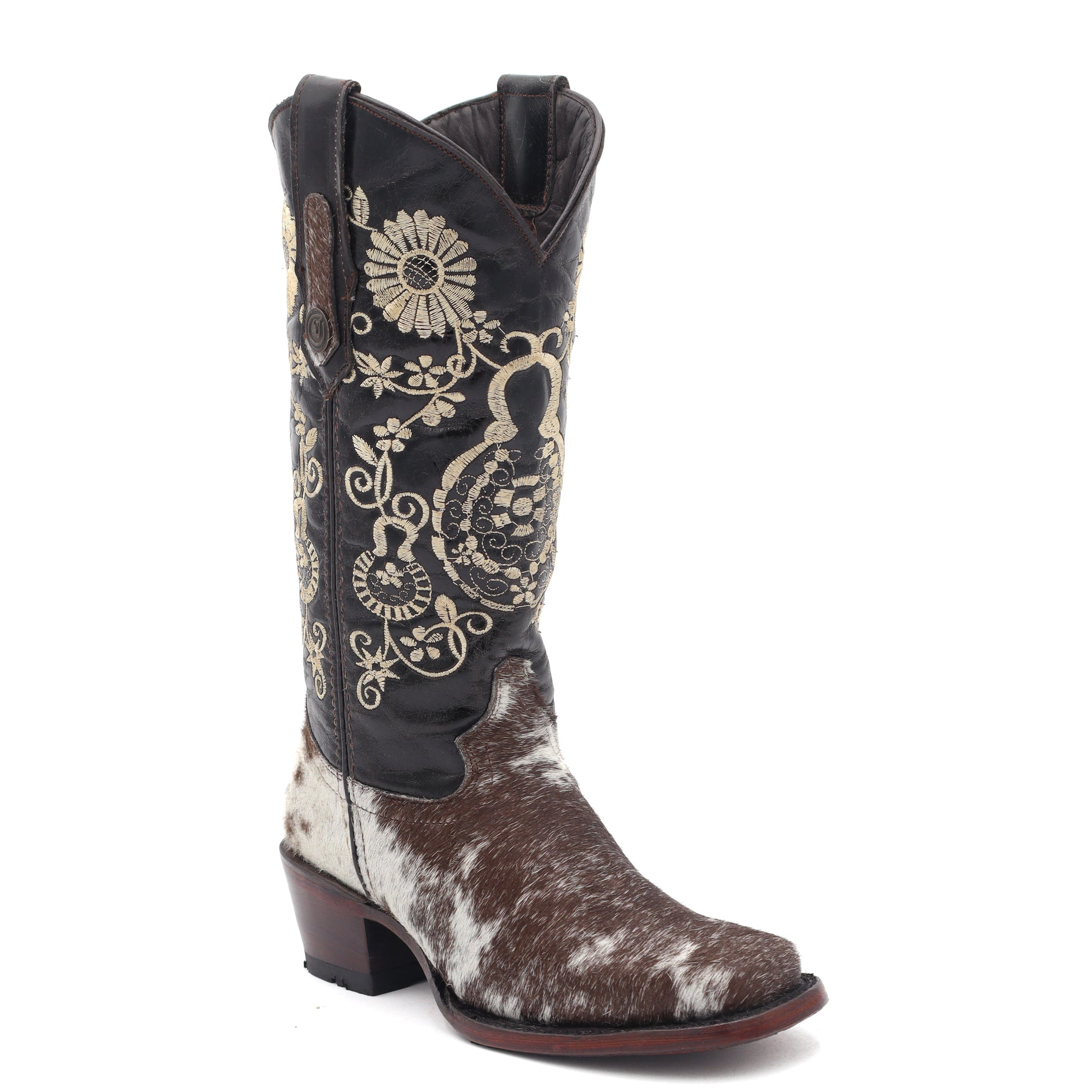 The Geretana Pelo Negro/Gris Cuadrada is a high boot with the traditional embroidered design of Zacatecas' arracadas. Feel stylish and rooted in Mexican culture with this unique footwear.