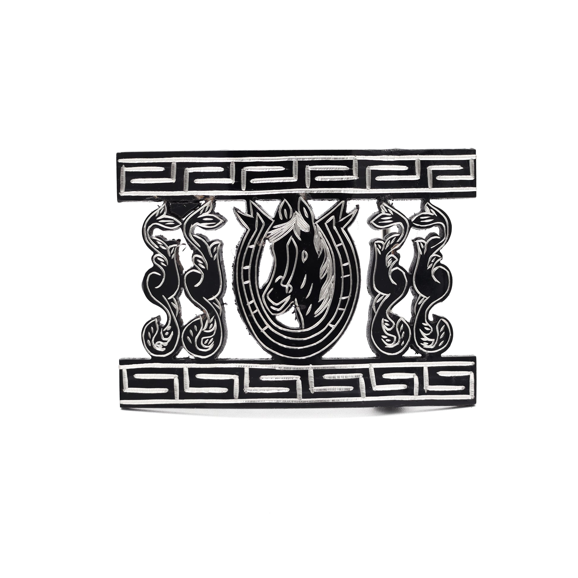 Hebilla de Acero Monel Negra - Caballo en herradura con pilares rameados entre olas
