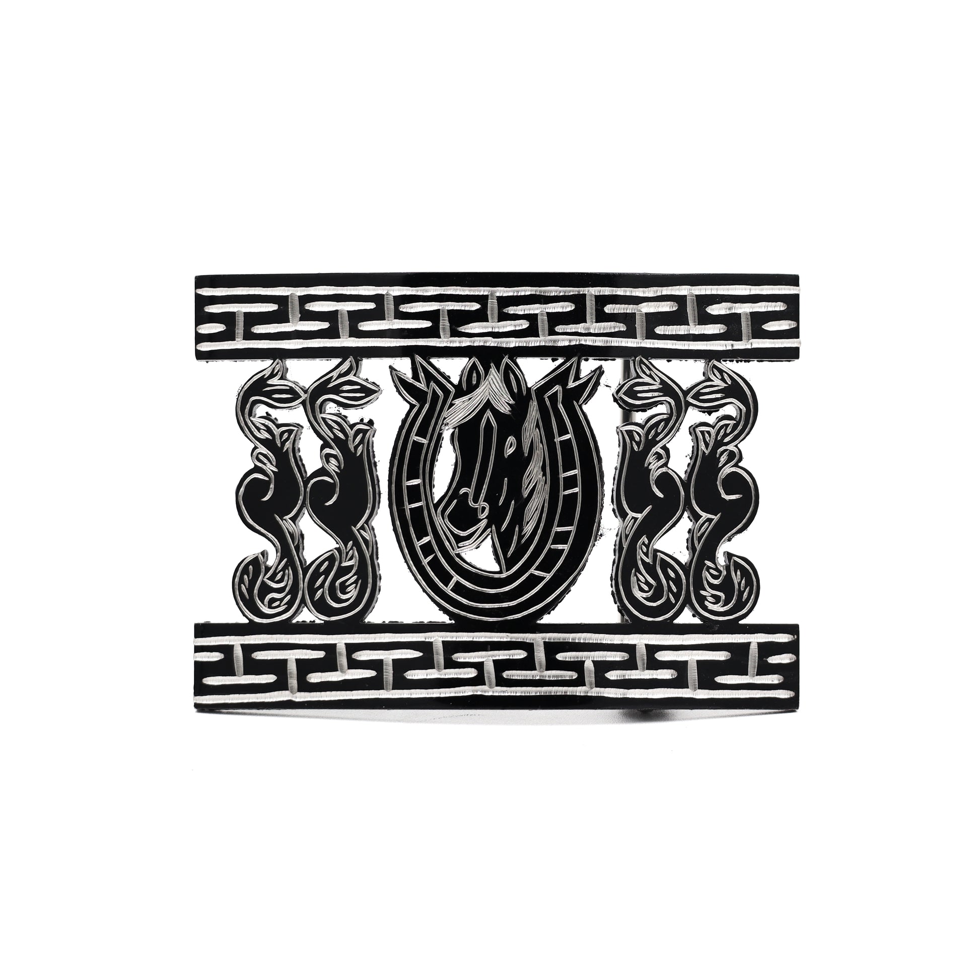 Hebilla de Acero Monel Negra - Herradura con caballo en grecas